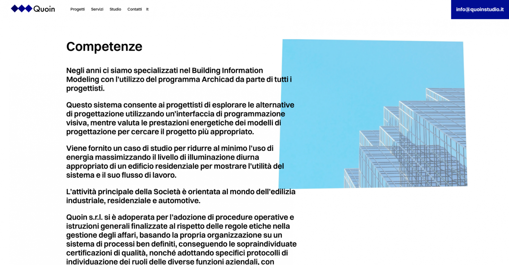 Lo studio Quoin conta su figure professionali formate per soddisfare ogni tipo di richiesta dei loro clienti. Serviva il giusto modo per raccontarlo e noi abbiamo deciso di strutturare una pagina che esponesse una ad una ogni loro competenza.